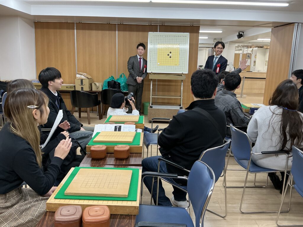 今回、新しく9路盤のGクラスが設けられました。出場したのは3チーム。最初に審判長の鶴山淳志八段から講義を受けてから試合に臨みました。そして、3チーム参加リーグなので、2チームが対戦します。1チーム余りますよね? その1チームはなんと、鶴山八段か安田明夏初段が3面で指導碁を打ってくれるというスペシャルがありました。